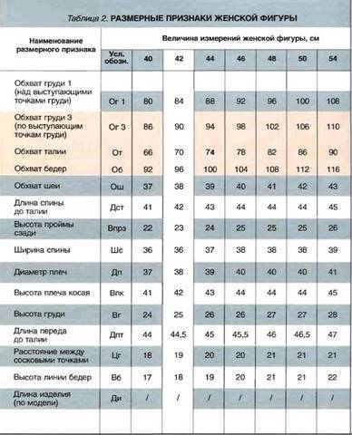 Размерные признаки женской фигуры. Таблица